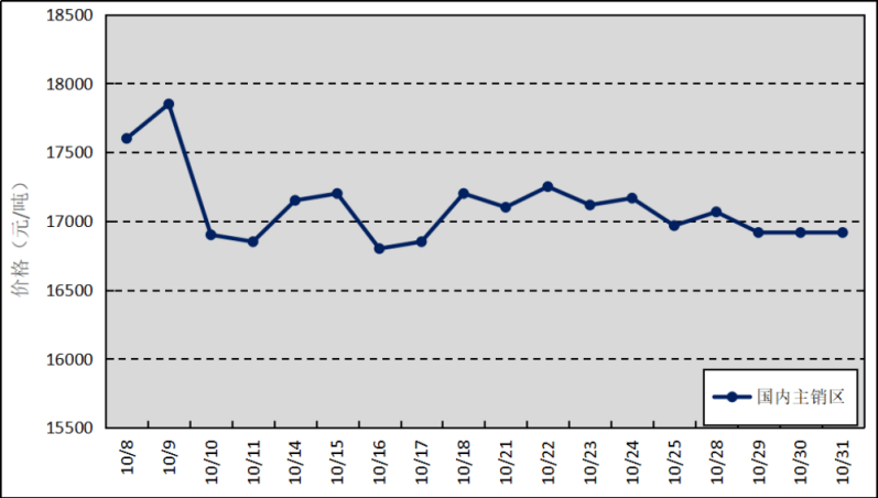 國內(nèi)主銷區(qū):10月,上海、青島和天津等銷區(qū)市場的國產(chǎn)全乳標(biāo)準(zhǔn)膠平均價(jià)格為17101元/噸,環(huán)比上漲1202元/噸,最高價(jià)為17850元/噸,最低價(jià)為16800元/噸。