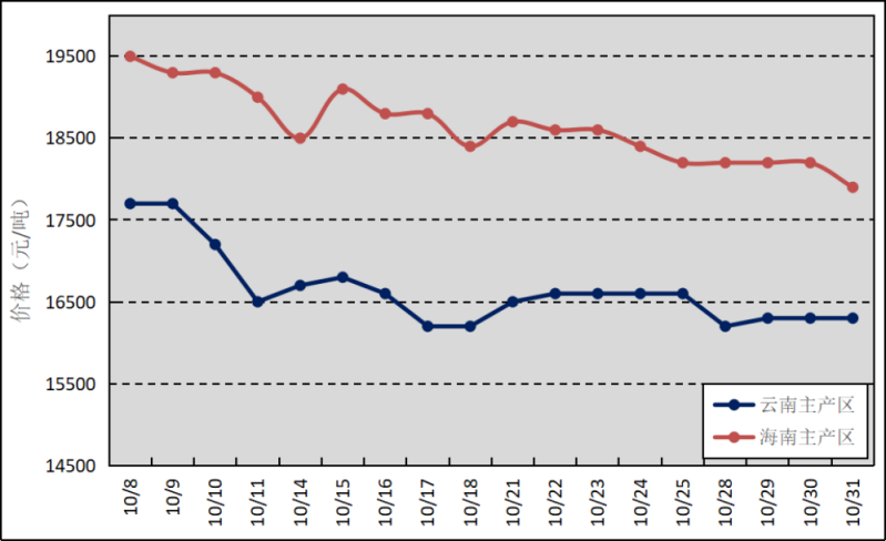 國內(nèi)主產(chǎn)區(qū):10月,除云南部分產(chǎn)區(qū)因季風(fēng)性落葉病暴發(fā)、海南部分產(chǎn)區(qū)受下旬降水?dāng)_動(dòng)明顯增多影響割膠作業(yè)外,國內(nèi)大部分產(chǎn)區(qū)割膠工作正常開展,膠乳產(chǎn)量逐步增加。云南、海南鮮膠乳(折干膠)月均價(jià)格分別為16644元/噸、18650元/噸,環(huán)比上漲901元/噸、2845元/噸。