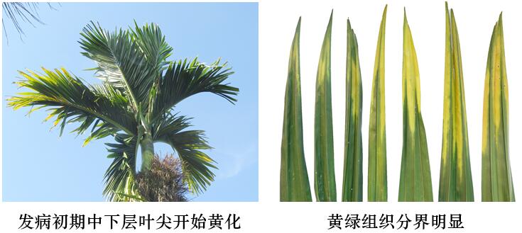 三、及時(shí)清理病株。及時(shí)清除樹冠最下部病葉枯葉;對(duì)于整個(gè)樹冠葉片都黃化甚至枯死,或樹冠縮小一半以上甚至枯頂?shù)牟≈?,?yīng)整株清除。發(fā)病率達(dá)70%以上的特重檳榔黃化病園,建議全園更新。
