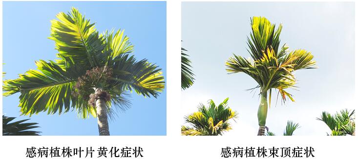 檳榔長(zhǎng)線形病毒黃化病是檳榔生產(chǎn)中新發(fā)現(xiàn)的一種重要病害,發(fā)病初期主要引起檳榔樹冠中下層葉片黃化,通常從葉尖開始變黃,黃化和綠色組織分界明顯,后期黃化癥狀擴(kuò)展到幼葉和上層葉片,發(fā)病嚴(yán)重時(shí)新葉無法正常展開,樹冠冠幅明顯減小,萎縮成束頂狀,喪失結(jié)果能力,最后整個(gè)樹冠黃化甚至枯頂死亡。9—12月,檳榔病蟲害監(jiān)測(cè)與防控項(xiàng)目專家組對(duì)海南省檳榔黃化發(fā)生危害情況開展調(diào)查和采樣檢測(cè),發(fā)現(xiàn)檳榔長(zhǎng)線形病毒黃化病發(fā)生普遍,在萬寧、瓊海、屯昌、保亭、三亞、定安、文昌、陵水、樂東、???、澄邁、五指山、儋州等市縣均有發(fā)生,平均發(fā)病率高達(dá)70%以上。