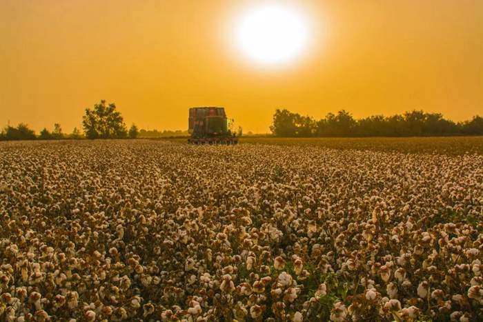 《希望田野》 新疆生產(chǎn)建設(shè)兵團第二師鐵門關(guān)市塔里木墾區(qū)33團采棉機在采棉。韓峻 攝