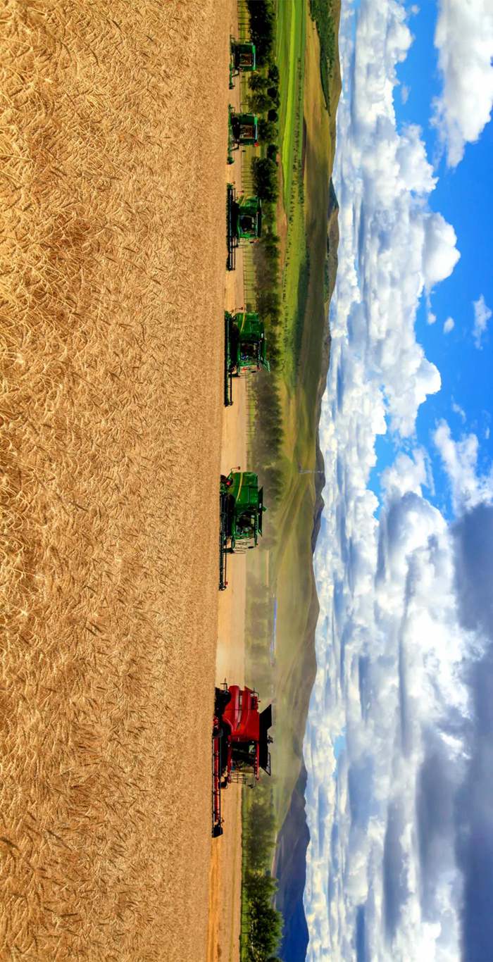 《田疇“畫”豐收》 內(nèi)蒙古興安農(nóng)墾索倫牧場規(guī)模化經(jīng)營管理區(qū)小麥?zhǔn)崭钭鳂I(yè)。王福財 攝