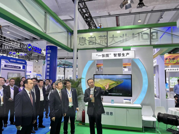 農(nóng)業(yè)農(nóng)村部副部長江文勝在中國農(nóng)墾展區(qū)聽取中國農(nóng)墾用地“一張圖”介紹