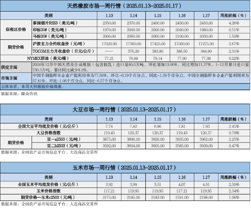天然橡膠、大豆、玉米市場一周行情(2025.01.13-01.17)