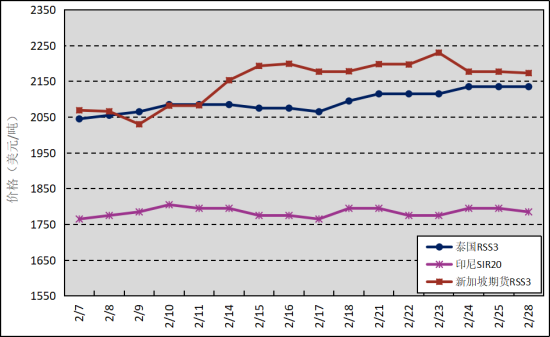 國(guó)外主產(chǎn)區(qū):2月,泰國(guó)RSS3平均價(jià)格為2093美元/噸,環(huán)比上漲44美元/噸,最高價(jià)為2135美元/噸,最低價(jià)為2045美元/噸;印尼SIR20平均價(jià)格為1784美元/噸,環(huán)比上漲11美元/噸,最高價(jià)為1805美元/噸,最低價(jià)為1765美元/噸;新加坡RSS3期貨主力合約月均結(jié)算價(jià)格為2149美元/噸,環(huán)比上漲161美元/噸,最高價(jià)為2230美元/噸,最低價(jià)為2030美元/噸。