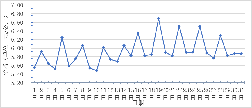 7月,全國重點監(jiān)測農(nóng)產(chǎn)品批發(fā)市場香蕉總交易量達2.3萬噸,同比上漲9.5%,環(huán)比上漲4.5%;總交易價值12746.5萬元,同比下降6.4%,環(huán)比上漲11.0%。日平均價格最高為6.7元/千克,最低為5.5元/千克,全月平均價格為 5.9元/千克,同比下降13.2%,環(huán)比上漲1.7%(每日價格變化如圖)。