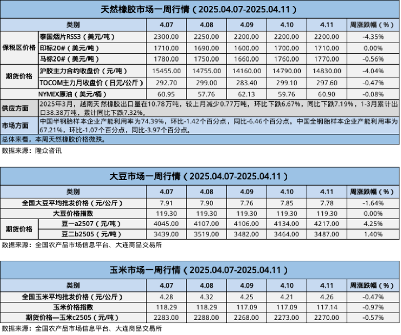 天然橡膠、大豆、玉米市場一周行情(2025.04.07-04.11)