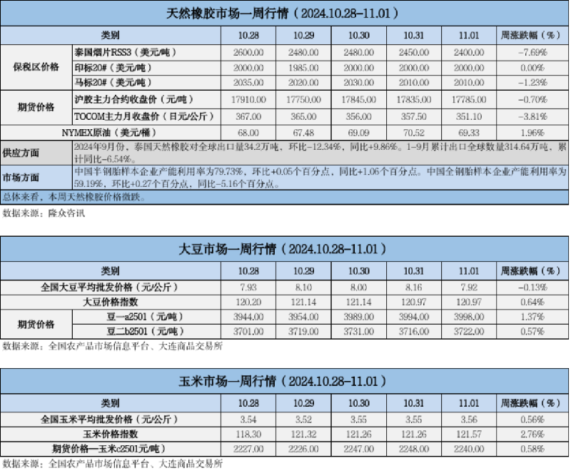 天然橡膠、大豆、玉米市場(chǎng)一周行情(2024.10.28-11.01)