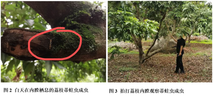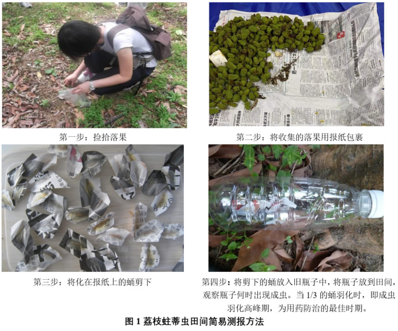 一、監(jiān)測方法:1.監(jiān)測落果中荔枝蒂蛀蟲的發(fā)育進度,預測蒂蛀蟲成蟲羽化高峰期。根據(jù)蒂蛀蟲田間簡易測報方法(如圖1),連續(xù)7-10天撿拾地下落果,收集并用一層報紙包裹,數(shù)日后剪下在報紙化蛹的荔枝蒂蛀蟲(蛹),置于空礦泉水瓶中,待瓶中有1/3的蛹羽化為成蟲,即為成蟲羽化高峰期,可用藥防治。2.監(jiān)測樹干上荔枝蒂蛀蟲成蟲。根據(jù)蒂蛀蟲成蟲白天棲于陰涼的樹冠內(nèi)枝桿上(如圖2),受到驚嚇時會飛離枝桿這一特性,于每天清晨對果園進行實地調(diào)查,每個果園按東南西北中五個方位進行定點監(jiān)測,每個方位取10-15株樹,在荔枝內(nèi)膛拍打莖桿(如圖3),發(fā)現(xiàn)有成蟲時,即可用藥防治。
