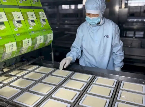 在北京,最知名的豆腐品牌當屬“白玉”。北京白玉食品有限公司每天可生產(chǎn)近30萬盒的盒裝豆腐,北京市場商超系統(tǒng)覆蓋率達90%,并實現(xiàn)對北京各大農(nóng)貿(mào)市場的全覆蓋。從泡豆、磨漿、煮漿、點腦、壓制到成型,21道自動化工序都遵循傳統(tǒng)技藝,展現(xiàn)了“白玉”的初心與追求。