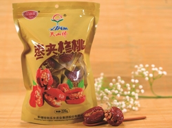 天山嬌干棗,原料多來自哈密大棗。哈密大棗是中國紅棗家族中一個(gè)相對獨(dú)立的優(yōu)良品種,是在新疆哈密由南平原戈壁特定氣候條件下經(jīng)長期馴化生成的果中珍品。古代謂之“香棗”,一直是獻(xiàn)給朝廷的上乘西域貢品。據(jù)史料考證,哈密栽培大棗已有兩千年的歷史,以其個(gè)大、皮薄、核小、肉厚、顏色好、含糖量高、干而不皺等優(yōu)點(diǎn),在國內(nèi)外市場上馳名。