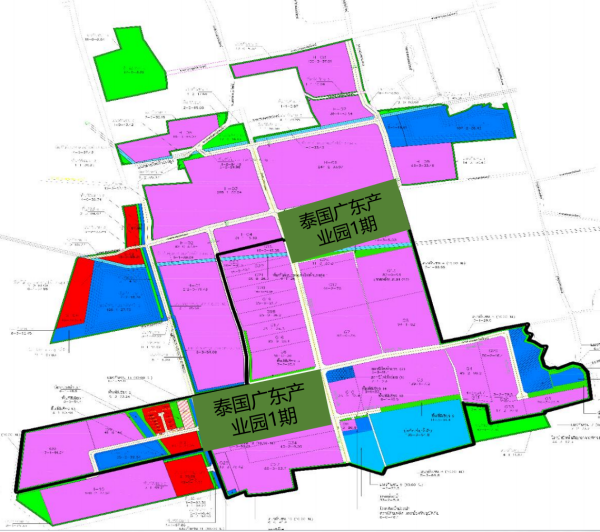 泰國廣東產(chǎn)業(yè)園總規(guī)劃6000畝,總投資額22億元人民幣。1期可開發(fā)面積332.89萊(約800畝,圖中深綠色地塊),2期可開發(fā)面積1455.91萊(約3495畝,圖中黑框外紫色地塊),3期規(guī)劃設(shè)計土地面積710萊(約1705畝)。