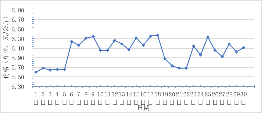 11月,全國重點監(jiān)測農產品批發(fā)市場香蕉總交易量達2.6萬噸,同比下降3.7%,環(huán)比基本保持一致;總交易價值 16391.6萬元,同比上漲8.4%,環(huán)比上漲1.5%。日平均價格最高為6.3元/千克,最低為5.6元/千克,全月平均價格為6.0元/千克,同比上漲7.1%,環(huán)比下降1.6%(每日價格變化如圖)。