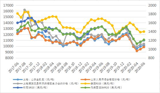 上半年天然橡膠市場價格總體處于低位。1-4月,受新冠肺炎疫情影響,市場交易低迷,價格下行,月均價環(huán)比跌幅最高達22.9%;5-6月,產(chǎn)業(yè)上下游復(fù)工復(fù)產(chǎn),全球貿(mào)易逐步恢復(fù),各國出臺刺激政策提振經(jīng)濟,價格震蕩回調(diào),月均價環(huán)比止跌回正,最高至3%-4%。上半年現(xiàn)貨國內(nèi)市場全乳膠上海、山東市場均價每噸10423元,同比跌7.7%;混合膠山東市場均價每噸10151元,同比跌12.8%?,F(xiàn)貨東南亞市場,泰國RSS3均價每噸1475美元,同比跌9.5%;印尼SIR20均價每噸1249美元,同比跌13.9%;馬來西亞SMR20均價每噸1251美元,同比跌13.4%。期貨市場上期所主力合約均價每噸10769元,同比跌9.5%。
