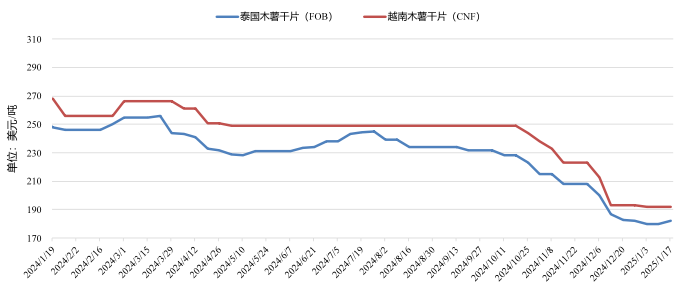 圖1  2024年1月份以來(lái)泰國(guó)、越南木薯干片價(jià)格變化情況