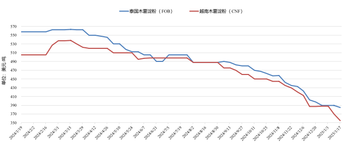 圖2  2024年1月份以來(lái)泰國(guó)、越南木薯淀粉外盤價(jià)格變化情況