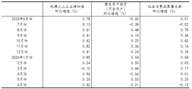 (2)根據(jù)季節(jié)調(diào)整模型自動(dòng)修正結(jié)果,對近一年來各期國內(nèi)生產(chǎn)總值、規(guī)模以上工業(yè)增加值、固定資產(chǎn)投資(不含農(nóng)戶)、社會消費(fèi)品零售總額環(huán)比增速進(jìn)行修訂。修訂結(jié)果及2024年二季度GDP環(huán)比數(shù)據(jù)、2024年6月份其他指標(biāo)環(huán)比數(shù)據(jù)如下: