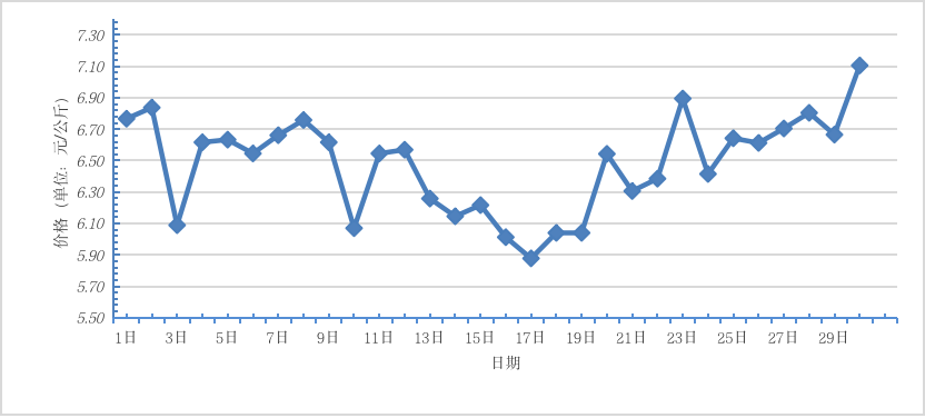 4月,全國(guó)重點(diǎn)監(jiān)測(cè)農(nóng)產(chǎn)品批發(fā)市場(chǎng)香蕉總交易量達(dá) 2.1萬(wàn)噸,同比下降77.4%,環(huán)比下降8.7%;總交易價(jià)值 16739.6萬(wàn)元,同比下降66.3%,環(huán)比上漲5.0%。日平均價(jià)格最高為7.1元/千克,最低為5.9元/千克,全月平均價(jià)格為 6.5元/千克,同比上漲20.4%,環(huán)比上漲10.2%(每日價(jià)格變化如圖)。