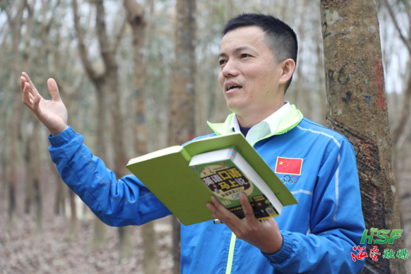 清晨的膠林,陽(yáng)光透過(guò)參差的橡膠葉,灑落在全國(guó)割膠狀元虞海濃的身上。他手捧著英語(yǔ)書(shū),邊讀邊記,不時(shí)在筆記本上記錄不熟悉的單詞。作為海南橡膠加釵分公司生產(chǎn)技術(shù)部部長(zhǎng),常年與割膠打交道的他,瘋狂學(xué)英語(yǔ)卻成了他最近的常態(tài)。