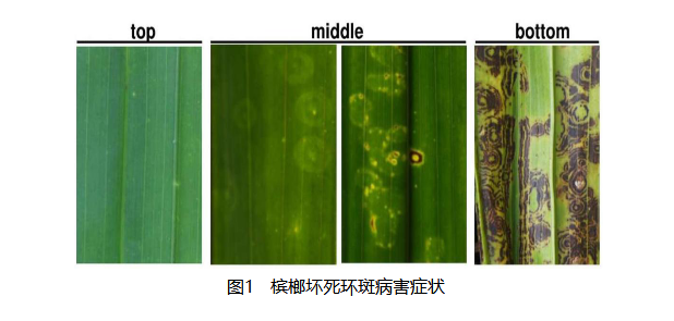 當前,海南定安、瓊海、萬寧、瓊中、陵水、保亭等主產區(qū)的檳榔正處于果實的采收期和新苗的定植期,果園內溫度適宜、濕度適中,利于傳播檳榔壞死環(huán)斑病毒的刺吸式傳毒昆蟲的生長繁殖,易造成檳榔壞死環(huán)斑病害的大面積流行。該病害發(fā)病初期在新葉基部隱約可見褪綠環(huán)斑,逐漸在中部及底部葉片出現(xiàn)壞死環(huán)斑(見圖),直至葉片徹底壞死。發(fā)病檳榔的葉片稀疏、下垂或伴有黃化現(xiàn)象,嚴重影響檳榔長勢及果實產量。