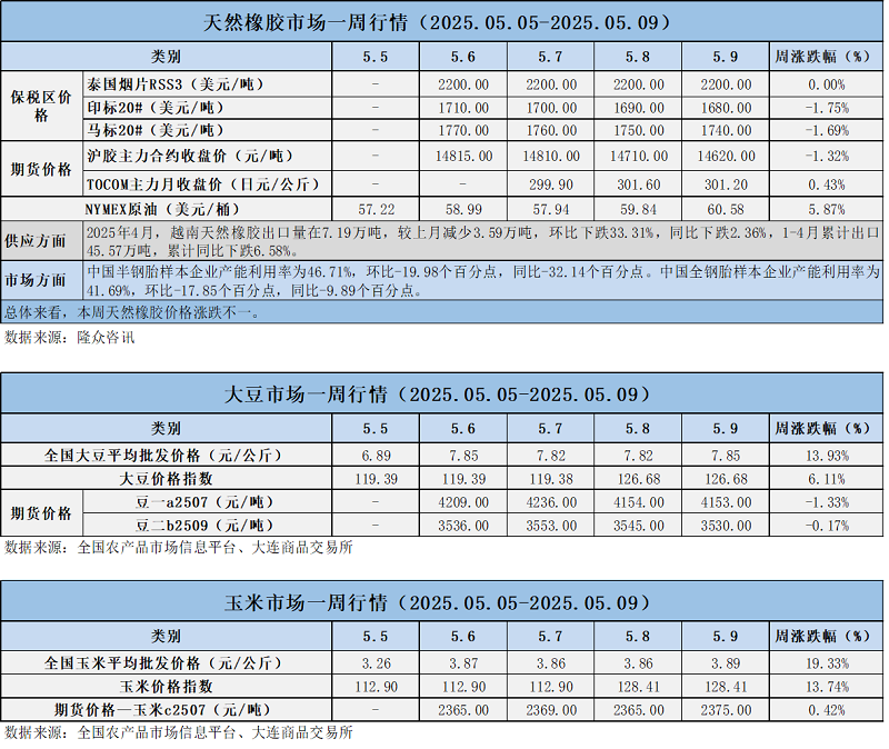 天然橡膠、大豆、玉米市場(chǎng)一周行情(2025.05.05-05.09)