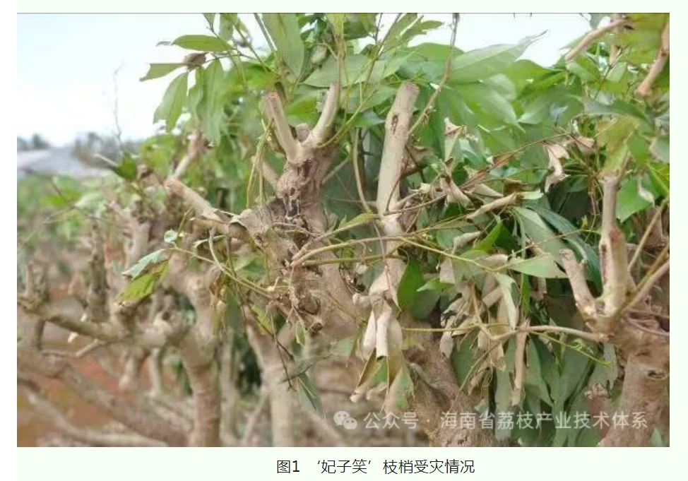 荔枝枝梢生長期正值海南的雨季,臺風活動頻繁。荔枝營養(yǎng)生長期遭遇強風暴雨易造成葉片破損、樹枝折斷,甚至整株倒伏,對荔枝來年的產量形成造成嚴重影響,為有效應對臺風災害對荔枝生產造成的不利影響,提出如下建議: