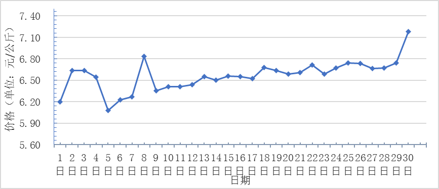 4月,全國重點監(jiān)測農(nóng)產(chǎn)品批發(fā)市場香蕉總交易量達2.2萬噸,同比下降28.1%,環(huán)比增長1.4%;總交易價值14001.8萬元,同比下降15.3%,環(huán)比增長14.0%。日平均價格最高為7.2元/千克,最低為6.1元/千克,全月平均價格為6.6元/千克,同比增長22.2%,環(huán)比增長11.9%(每日價格變化如圖)。