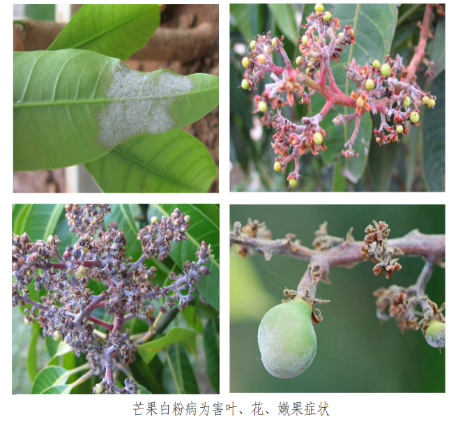 當(dāng)前,廣西、云南、四川、廣東、貴州、福建等主產(chǎn)區(qū)的芒果正處于花果期、果實(shí)膨大期等物候期,果園內(nèi)濕度高、氣溫低,芒果白粉病易于發(fā)生危害。開始時(shí)該病害在葉片上產(chǎn)生白色粉狀物,逐漸在老葉上產(chǎn)生紅褐色病斑;侵染花穗時(shí),在花穗上產(chǎn)生白色粉狀物,小花穗褐色枯死,降低坐果率,落花落果嚴(yán)重;侵染幼嫩果實(shí)時(shí),白色粉狀物覆蓋幼果,果皮逐漸凹陷、粗糙,產(chǎn)生紅褐色銹狀物。
