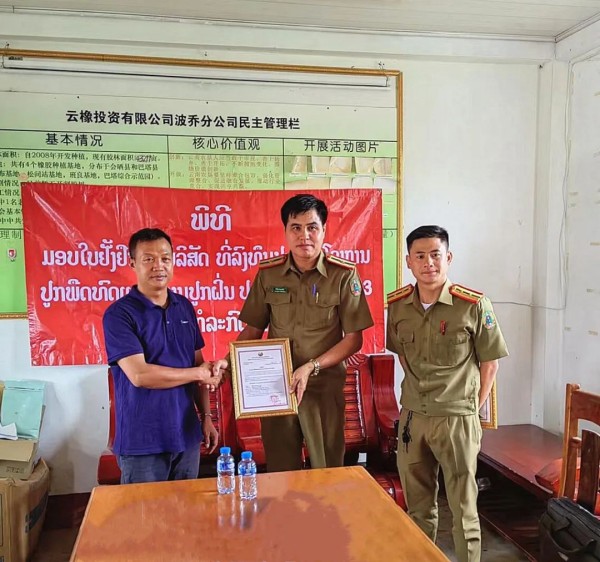 7月6日,老撾波喬省公安廳罌粟替代種植檢查考核領(lǐng)導(dǎo)小組副組長(zhǎng)坎恩·酸巴帝到云橡投資有限公司波喬分公司頒發(fā)“罌粟替代種植優(yōu)秀企業(yè)”證書。