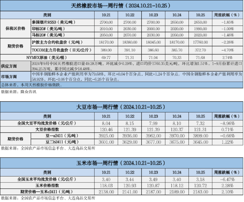 天然橡膠、大豆、玉米市場一周行情(2024.10.21-10.25)