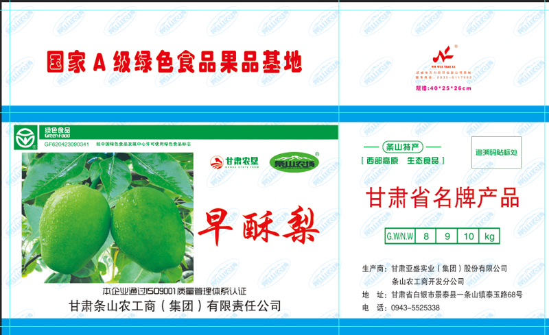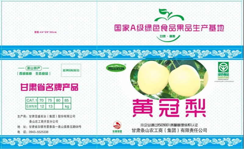 條山農(nóng)場從1993年開始實施綠色食品的生產(chǎn)與認證的基礎性工作,先后有啤酒大麥、啤酒花、大接杏、早酥梨、黃金梨、黃冠梨、紅富士蘋果、馬鈴薯、洋蔥、枸杞、杏醬、番茄醬等12個產(chǎn)品被中國綠色食品發(fā)展中心認定為綠色食品;林果基地被認定為國家A級綠色食品果品生產(chǎn)基地,被國家標準化管理委員會批準為國家級農(nóng)業(yè)標準化早酥梨種植示范區(qū)。隨著產(chǎn)業(yè)結構調(diào)整,目前已成規(guī)模化、產(chǎn)業(yè)化發(fā)展的綠色食品有“條山牌”早酥梨、黃冠梨、大接杏、紅富士蘋果、加工型馬鈴薯5個產(chǎn)品;早酥梨、黃冠梨通過有機食品認證;馬鈴薯、果品通過了出口產(chǎn)品基地備案認證,果品包裝獲得出口注冊登記;條山梨被認定為國家地理標志產(chǎn)品;條山牌榮獲“2015中國十大梨品牌”和“2015中國果品百強品牌”稱號;早酥梨蟬聯(lián)中國綠色食品博覽會金獎、榮獲2017甘肅農(nóng)業(yè)博覽會金獎;黃冠梨、早酥梨榮獲2017年甘肅名牌產(chǎn)品稱號;“條山”牌早酥梨入選“甘味”農(nóng)產(chǎn)品企業(yè)商標品牌名錄。建成了高標準的綠色食品果品基地1萬畝(有機果品1061.1畝)、馬鈴薯基地場內(nèi)場外各1萬畝,輻射帶動周邊市縣發(fā)展林果業(yè)30萬畝。
