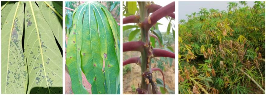 由木薯細菌性萎蔫病引起的木薯葉片角斑、莖稈溢菌和植株枯萎癥狀