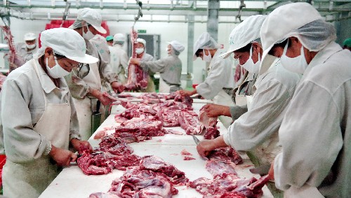 賀蘭山清真肉羊加工基地的工人正在分揀羊肉。