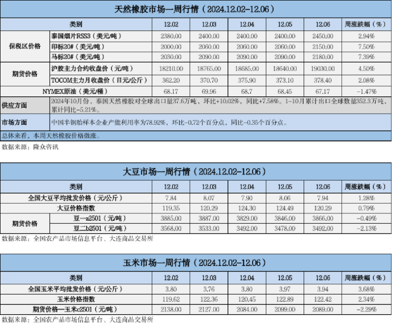 天然橡膠、大豆、玉米市場一周行情(2024.12.02-12.06)