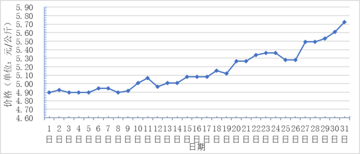 5月,全國(guó)重點(diǎn)監(jiān)測(cè)農(nóng)產(chǎn)品批發(fā)市場(chǎng)香蕉總交易量達(dá)2.6萬(wàn)噸,同比上漲13.0%,環(huán)比下降16.1%;總交易價(jià)值13112.7萬(wàn)元,同比下降19.9%,環(huán)比下降20.7%。日平均價(jià)格最高為5.7元/千克,最低為4.9元/千克,全月平均價(jià)格為 5.2元/千克,同比下降18.8%,環(huán)比下降3.7%(每日價(jià)格變化如圖)。