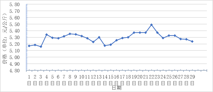 2月,全國重點(diǎn)監(jiān)測農(nóng)產(chǎn)品批發(fā)市場香蕉總交易量達(dá)1.9萬噸,同比下降13.6%,環(huán)比下降20.8%;總交易價(jià)值9969.1萬元,同比下降32.4%,環(huán)比下降51.7%。日平均價(jià)格最高為5.5元/千克,最低為5.2元/千克,全月平均價(jià)格為5.3元/千克,同比下降13.1%,環(huán)比基本持平(每日價(jià)格變化如圖)。