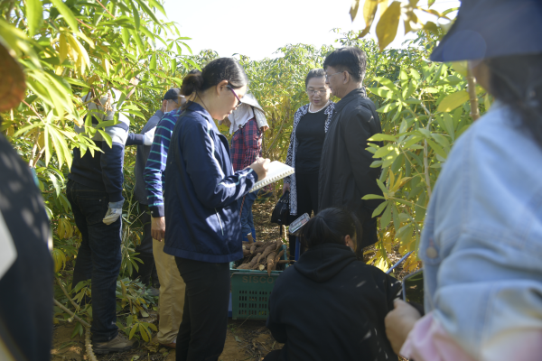 以中國熱帶農(nóng)業(yè)科學(xué)院品資所陳松筆研究員為組長,熱科院郭建春研究員、黃潔研究員、陸小靜副研究員和廣西亞熱帶作物研究所李軍研究員為成員的專家組,在合浦縣石灣鎮(zhèn)清水村木薯基地對申請品種進行了現(xiàn)場測產(chǎn)與品質(zhì)鑒定,并認真聽取了選育團隊對木薯“桂木薯10號”和“桂木薯11號”新品種選育情況的匯報,就有關(guān)問題進行了質(zhì)詢,一致同意木薯“桂木薯10號”和“桂木薯11號”通過現(xiàn)場鑒評。