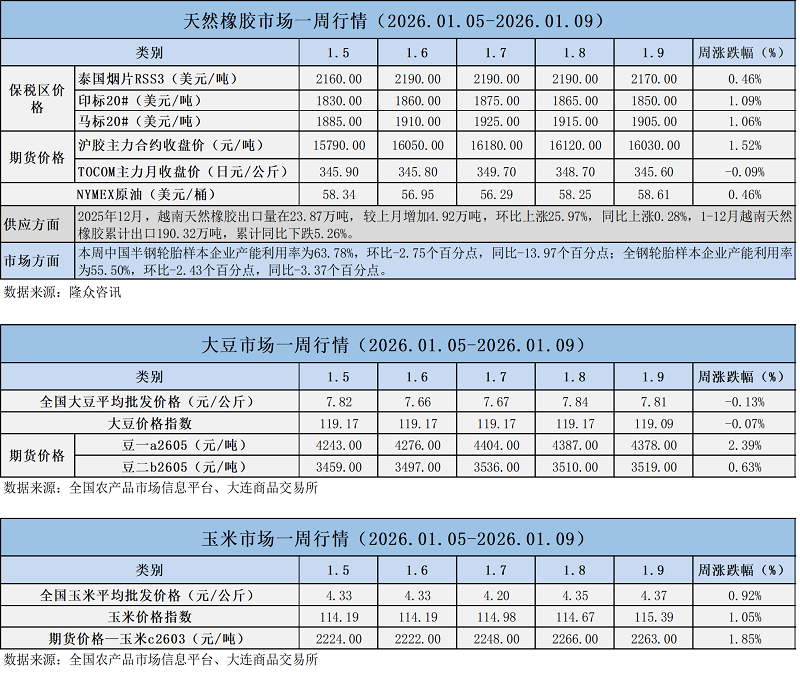 天然橡膠、大豆、玉米市場一周行情(2026.01.05-01.09)