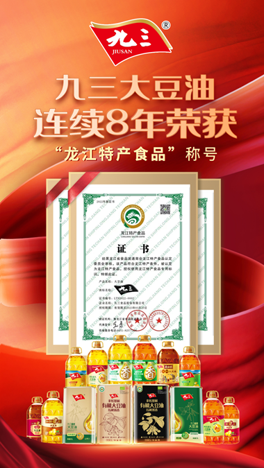 “九三”大豆油連續(xù)8年榮獲“龍江特產(chǎn)食品”稱號(hào)