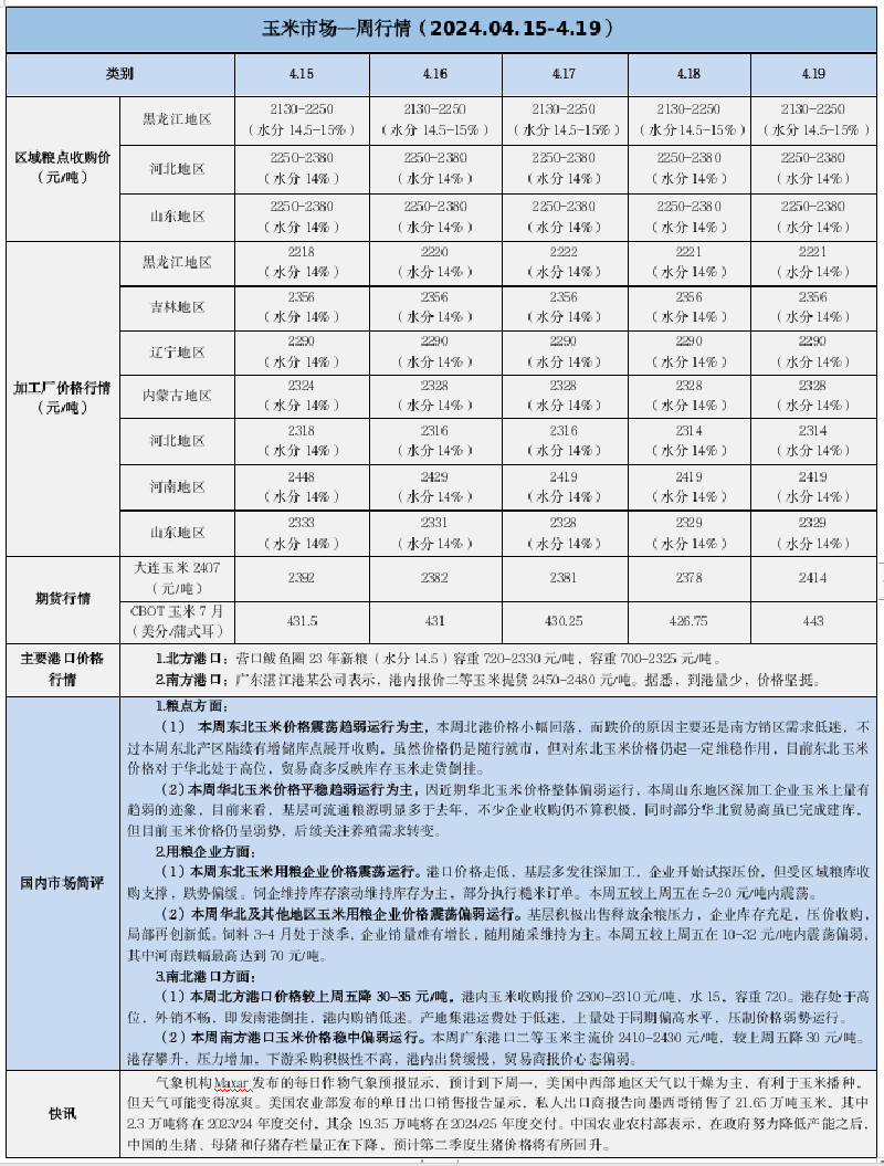 天然橡膠、大豆、玉米市場(chǎng)一周行情(2024.04.15-04.19)