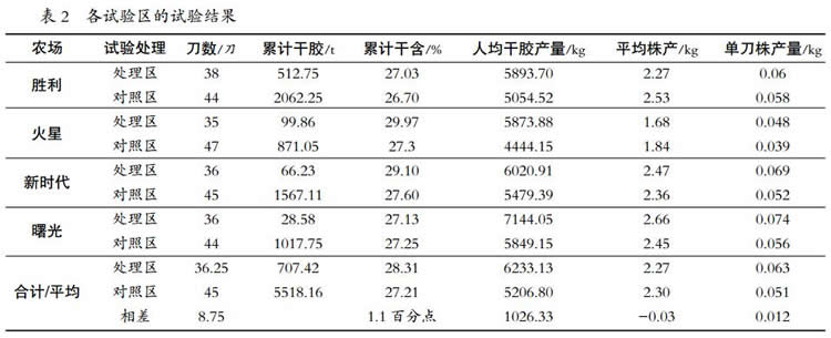 處理區(qū)平均株產(chǎn)干膠 2.27 kg,比對(duì)照低 0.03 kg/株,減幅 1.30%;處理區(qū)平均單刀產(chǎn)干膠 0.063 kg/(株·刀),比對(duì)照高 0.012 kg/(株·刀),增幅 23.53%(表 2)。