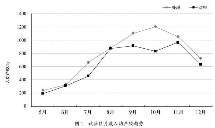 試驗(yàn)區(qū)人均干膠產(chǎn)量比對(duì)照區(qū)高1026.33 kg,增幅 19.71%。實(shí)行超低頻割制提高了人均干膠產(chǎn)量,增加了膠工收入,對(duì)穩(wěn)定膠工隊(duì)伍具有積極的作用。