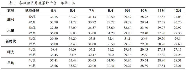 處理區(qū)年平均干含 28.31%,比對(duì)照高 1.1 百分點(diǎn)。火星、新時(shí)代、曙光和勝利 4 個(gè)處理區(qū)的干含依次分別為 29.97%、29.1%、27.13%和 27.03%,分別比各自對(duì)照高 2.67、1.5、-0.12、0.33 百分點(diǎn)(表 2)。