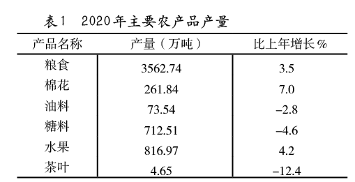 表1  2020年主要農(nóng)產(chǎn)品產(chǎn)量